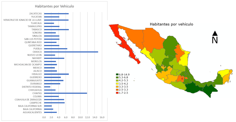 El primero en considerarse fue el número de habitantes que existen por cada vehículo en el estado, y los resultados fueron los siguientes: