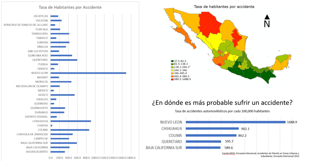 El promedio de accidentes en el 2015 en México fue de 11,907.06 durante el 2015, para calcular la tasa de habitantes que existen por cada accidente automovilístico terrestre dado por estado se consideró la población total y el número de accidentes registrados dentro de la entidad. El resultado corresponde al número de accidentes por cada 100,000 habitantes.